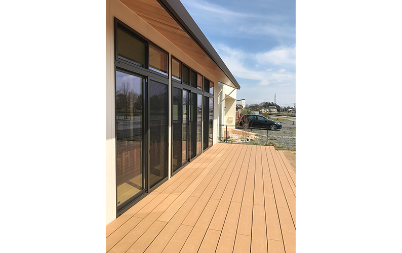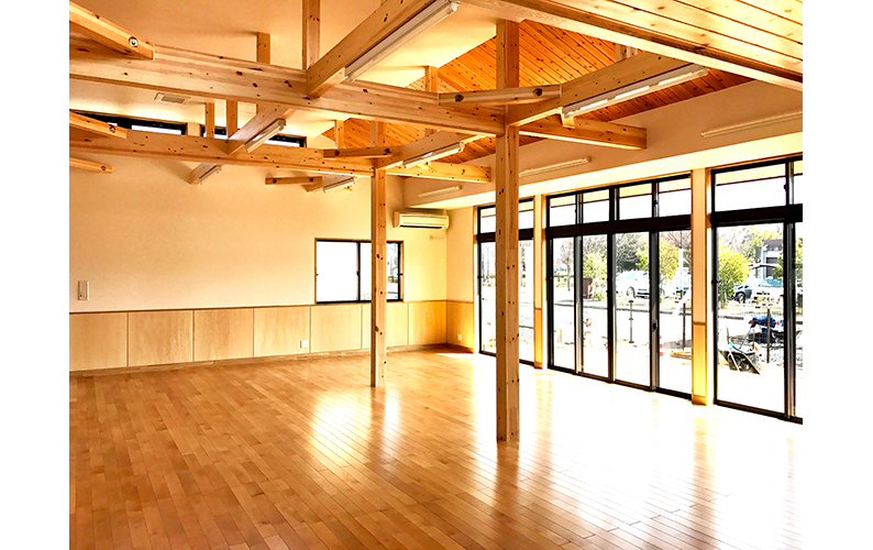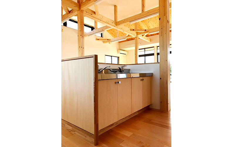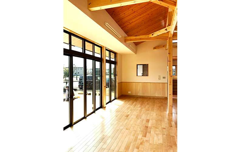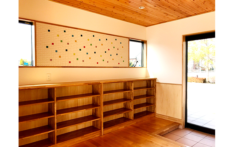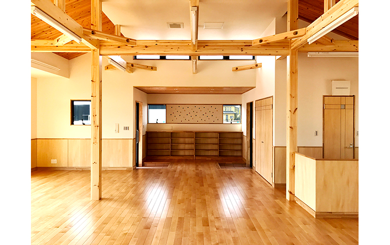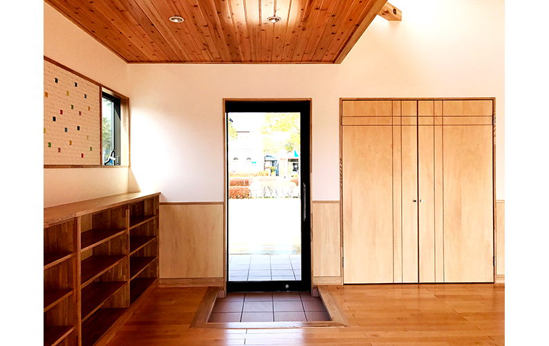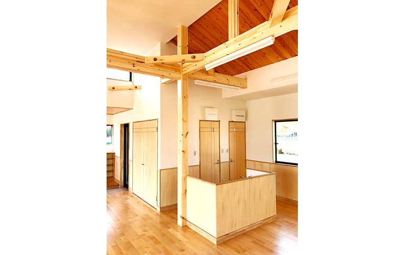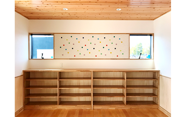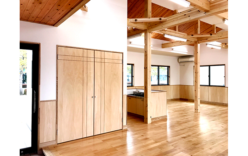 内部においては、軒天の羽目板を内部にも採用する事で外部とのさりげない繋がりを演出しつつ、利用する児童に配慮し、床や枠類にも天然木を採用することで優しい温もりを演出すると共に、建具、下駄箱や流し台等の家具類もオリジナルの制作品としてトータルコーディネートしました。