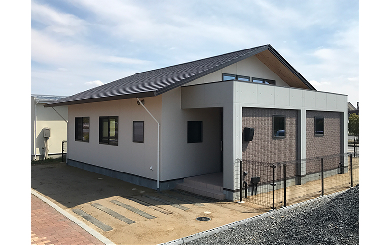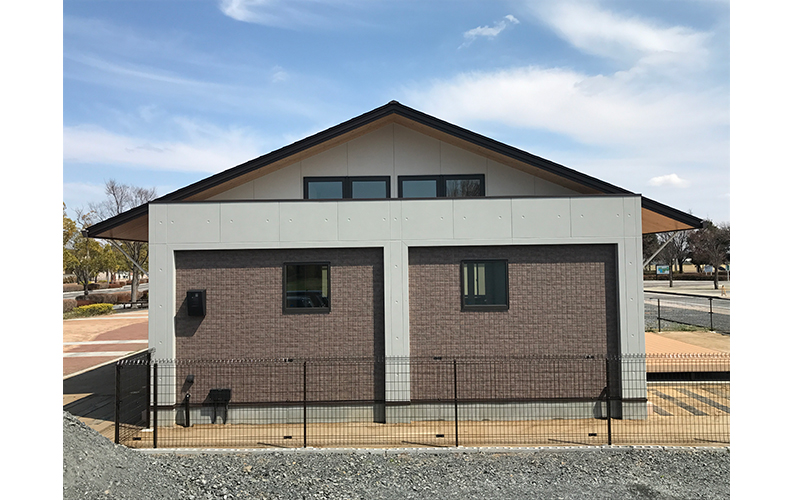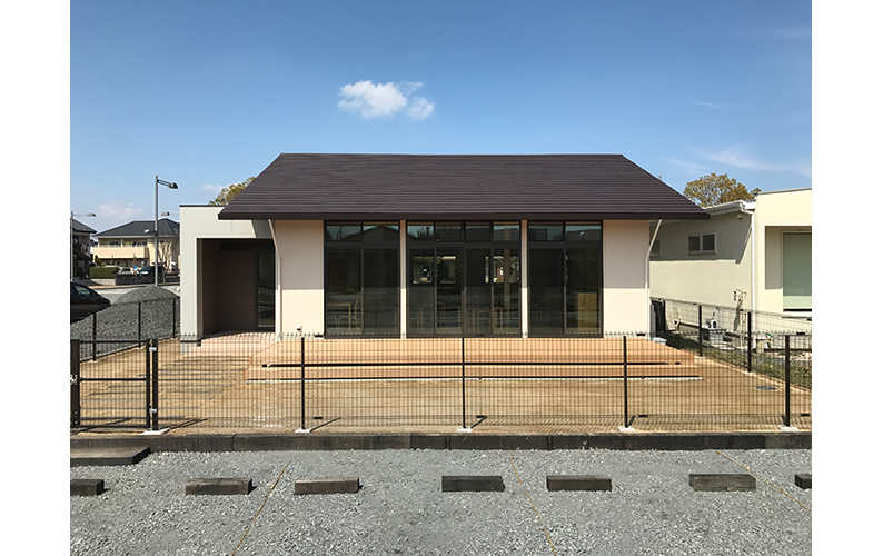 こちらの建物は学童保育施設(児童クラブ)。運営する保育園の正面に位置する事もあり、RC造の既存建物を彷彿させるデザインを心掛けました。 西側のシンメトリーとRC造風のファサードがポイントです。