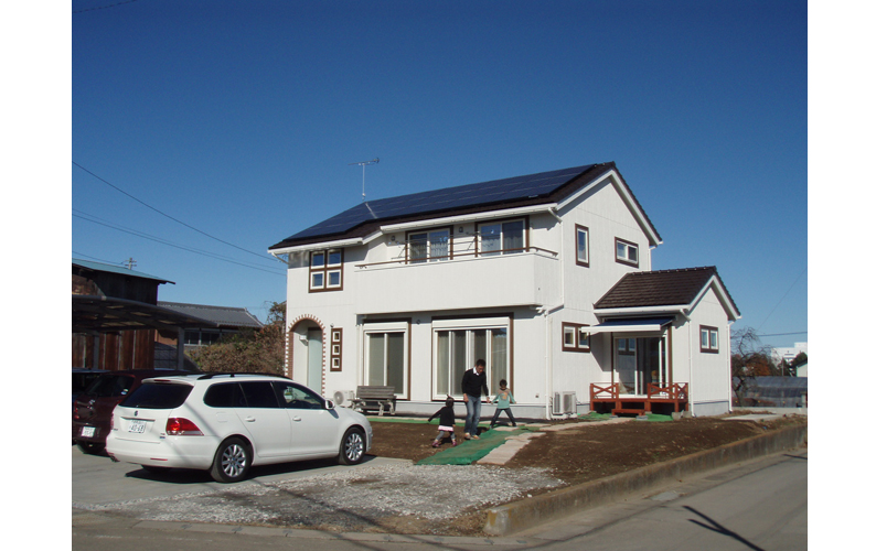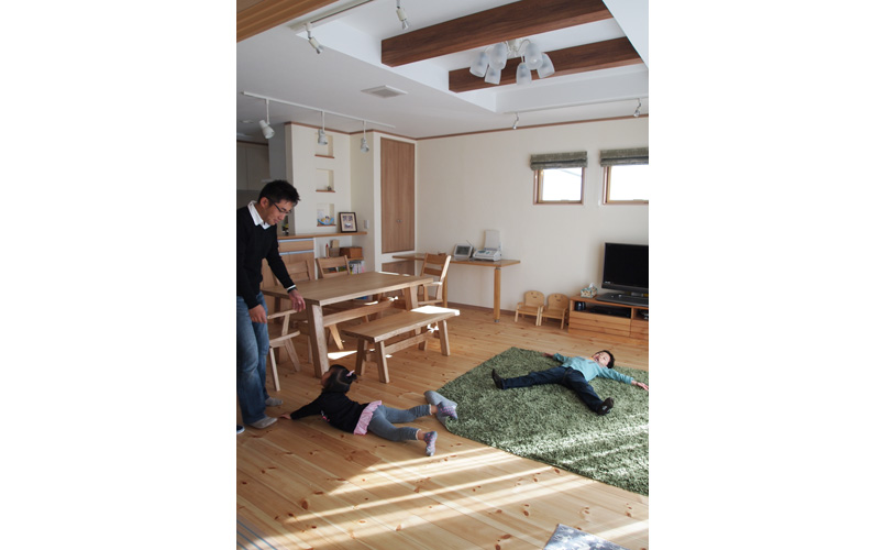 パインのムクフロアを基調としたナチュラル系のインテリア、また、ソーラーパネルも搭載したエコハウスです。