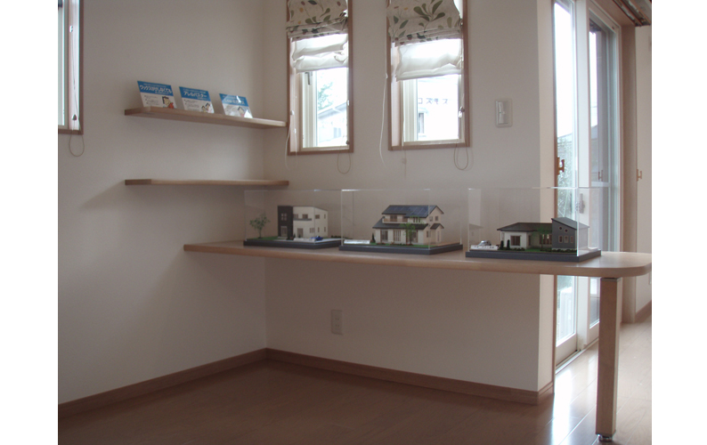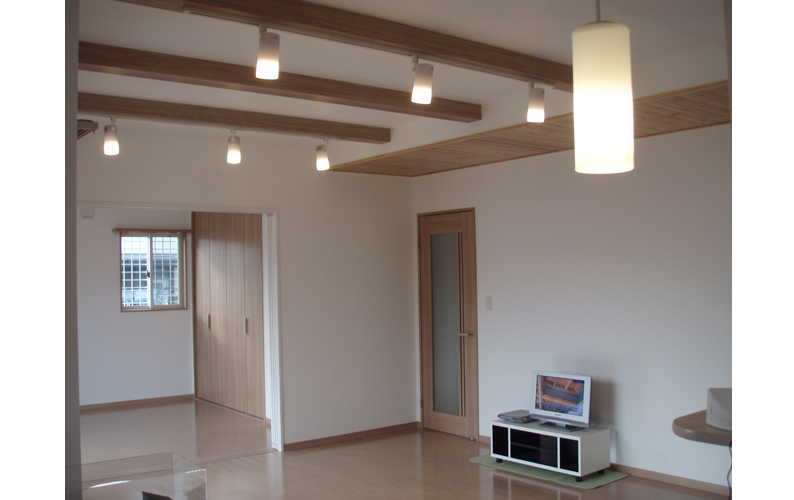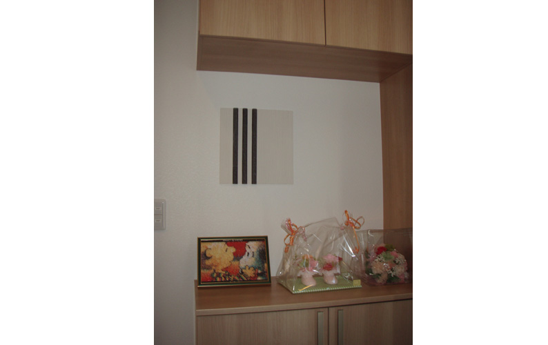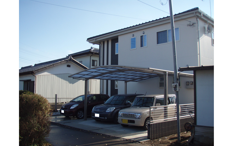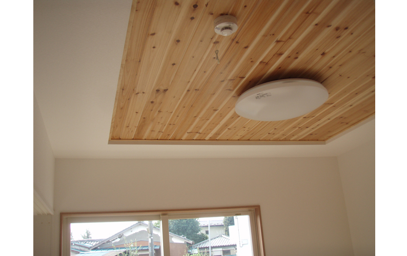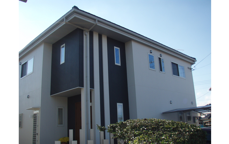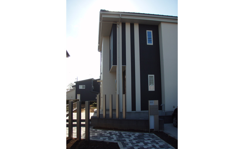 こちらのお宅は北側道路に面しています。北側は窓が少なかったりと、デザインしにくくなりがちですが、玄関周りの外壁と軒の深さに変化を持たせ、また特徴的な造作を施し外構とも関連付ける事で、北面のファサードにメリハリを付けました。 内部では天井に杉の羽目板を使用し、ナチュラルな雰囲気で統一されています。