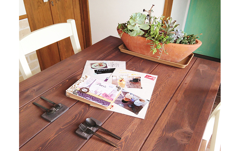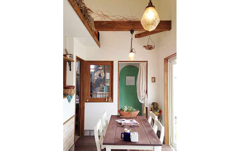 お店のメージカラーである淡いブルーグレーの鎧戸や内部の木製建具はすべてオリジナルの製作品。