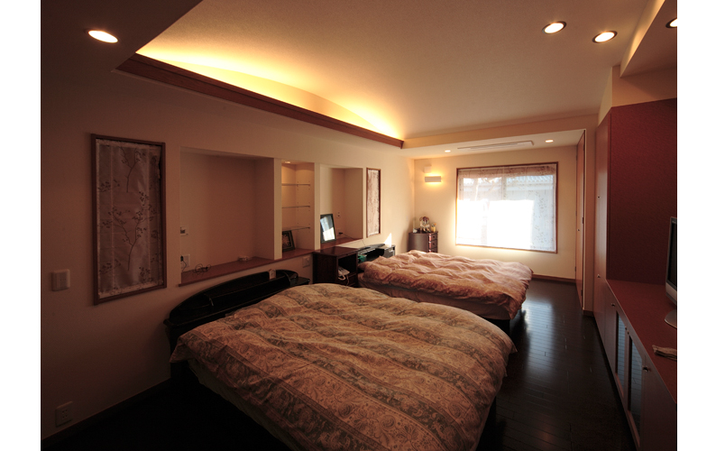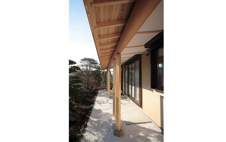 南側の深い軒は、夏季の直射日光を遮へいし、和室リビングのサンテラス的な役割を果たしご友人の多いご夫婦の憩いの空間です。