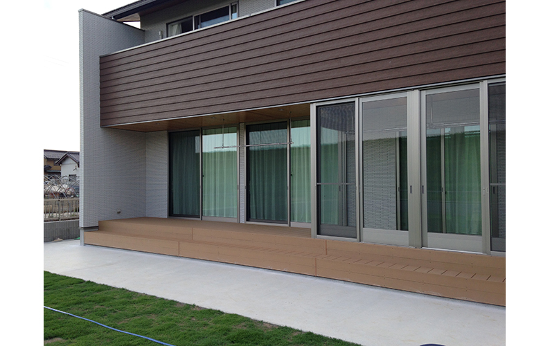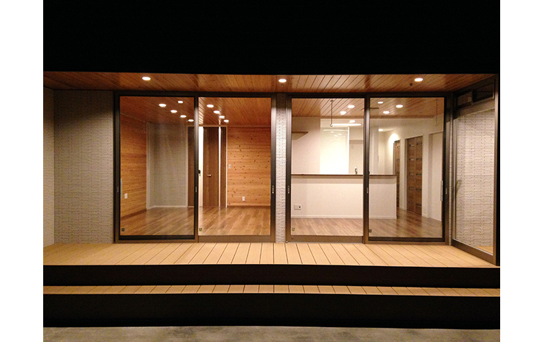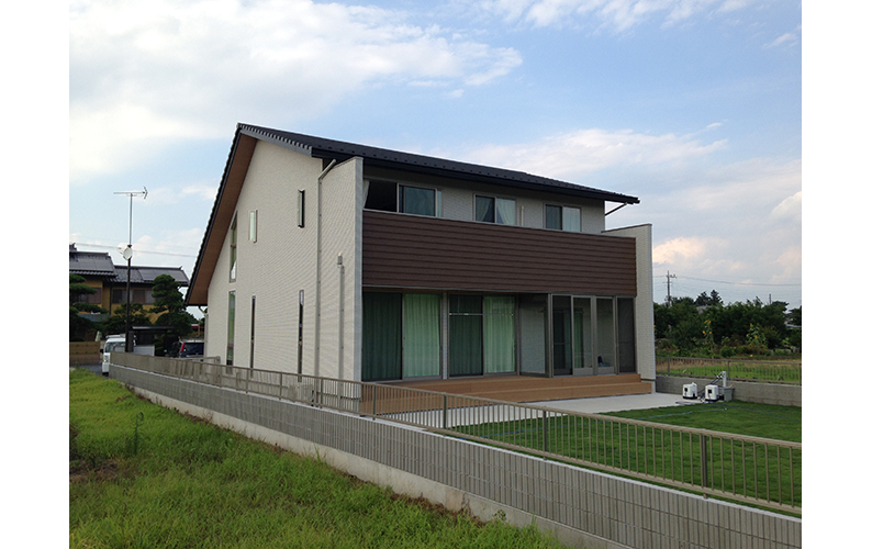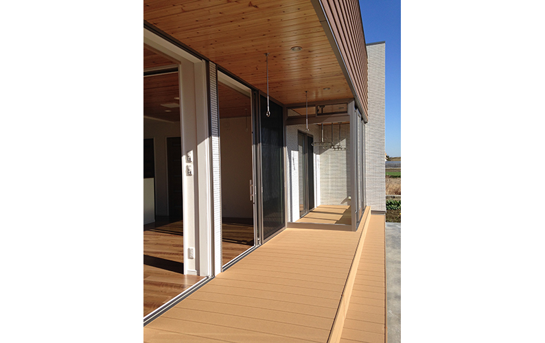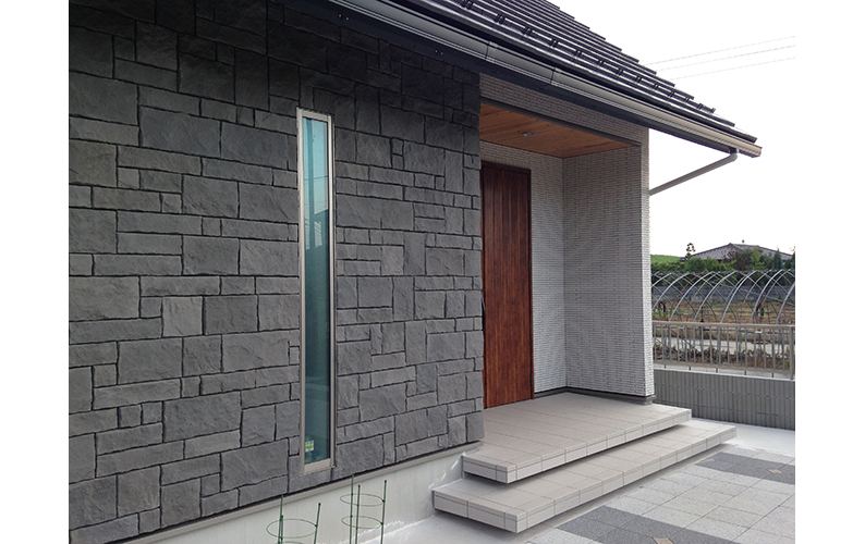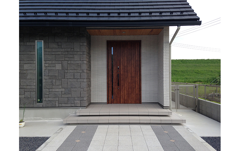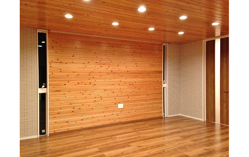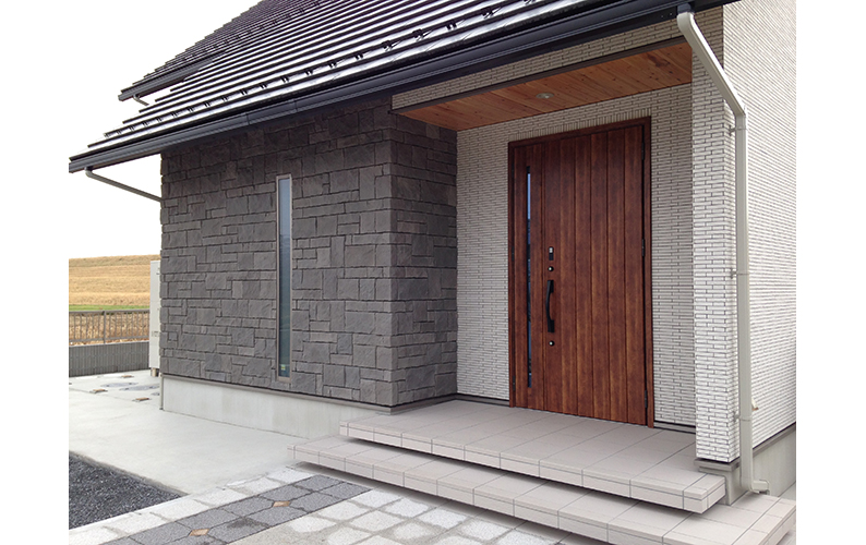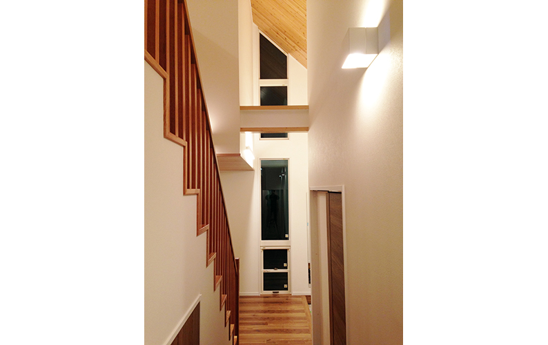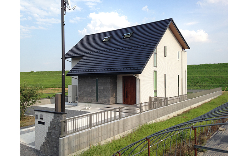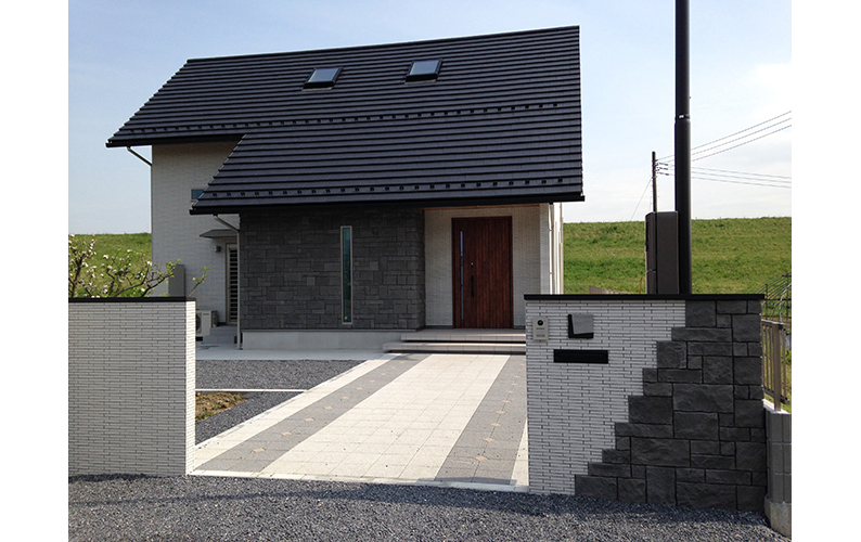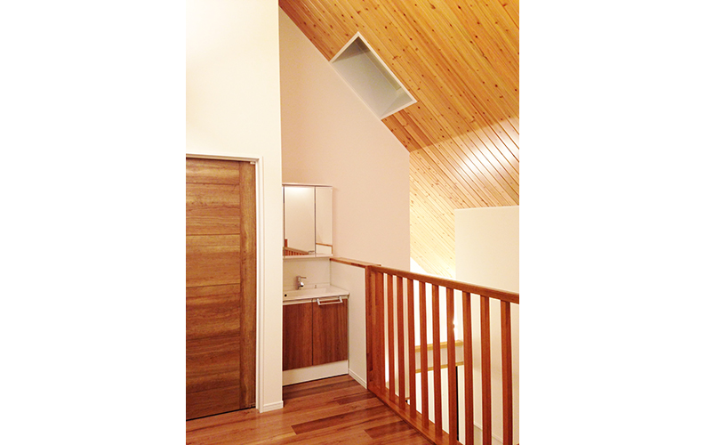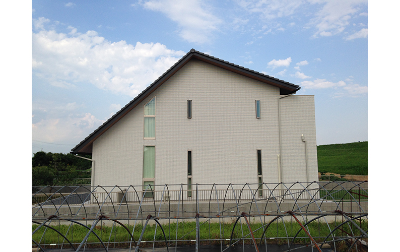 特徴は1階と2階の桁を登り梁で結んだ8.8/10勾配の大屋根。 そのダイナミックな勾配はそのまま内部の勾配天井として、天然木の豊かな風合いと共に来る人を迎え入れます。また、その天然木の羽目板や外壁タイルなど、内外に渡り使用することで、外と内をさりげなく繋ぐ効果を狙いました。